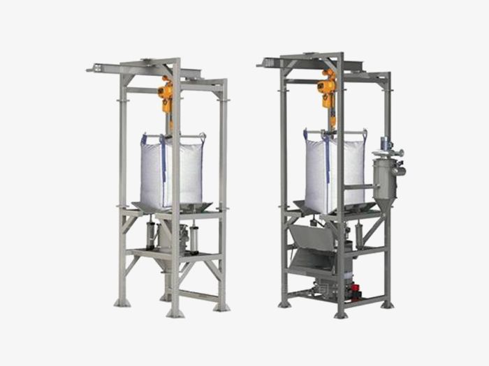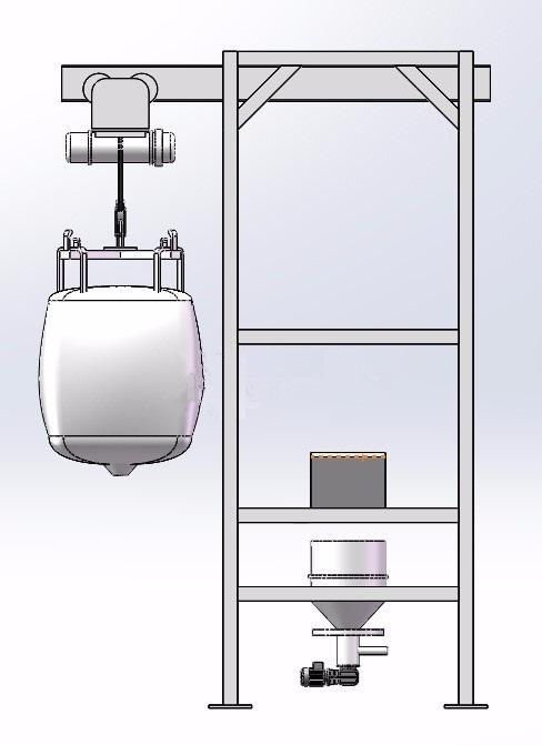 主體結構:卸料站框架支撐結構、噸袋起重裝置、噸袋吊架、噸袋支撐按摩板、袋口控制閥、密封裝置。
