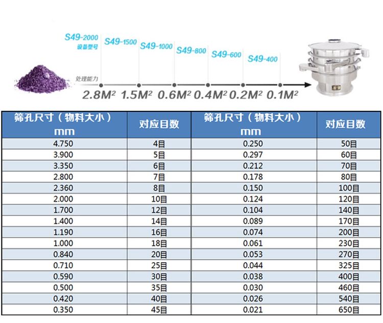 任何顆粒、粉末、粘液一定范圍內(nèi)均可篩選。篩分細(xì)至500目或0.028mm, 過濾小可至5微米。分級篩選,可篩一至五層篩網(wǎng),能同時進(jìn)行二至六個等級的分選或過濾。