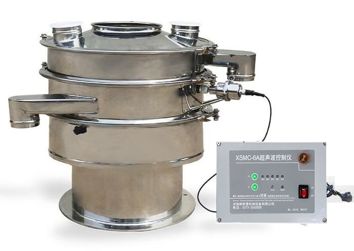 超聲波振動篩是將220V、50Hz或110V、60Hz電能轉化為36KHz的高頻電能,輸入超聲換能器,將其變成36KHz機械振動,產生的功率超聲波使篩網作高頻振動。篩網上的物料在作低頻旋振運動的同時,疊加上超聲振動,既可防止網孔堵塞,又可使篩分機提高產量和質量,從而達到快速篩分和清網的目的,使超微細粉篩分成為易事。該系統在傳統的振動篩基礎上在篩網上引入一個低振幅、高頻率的超聲振動波(機械波),以改變超微細分體的篩分性能。特別適合高附加值精細分體的用戶使用